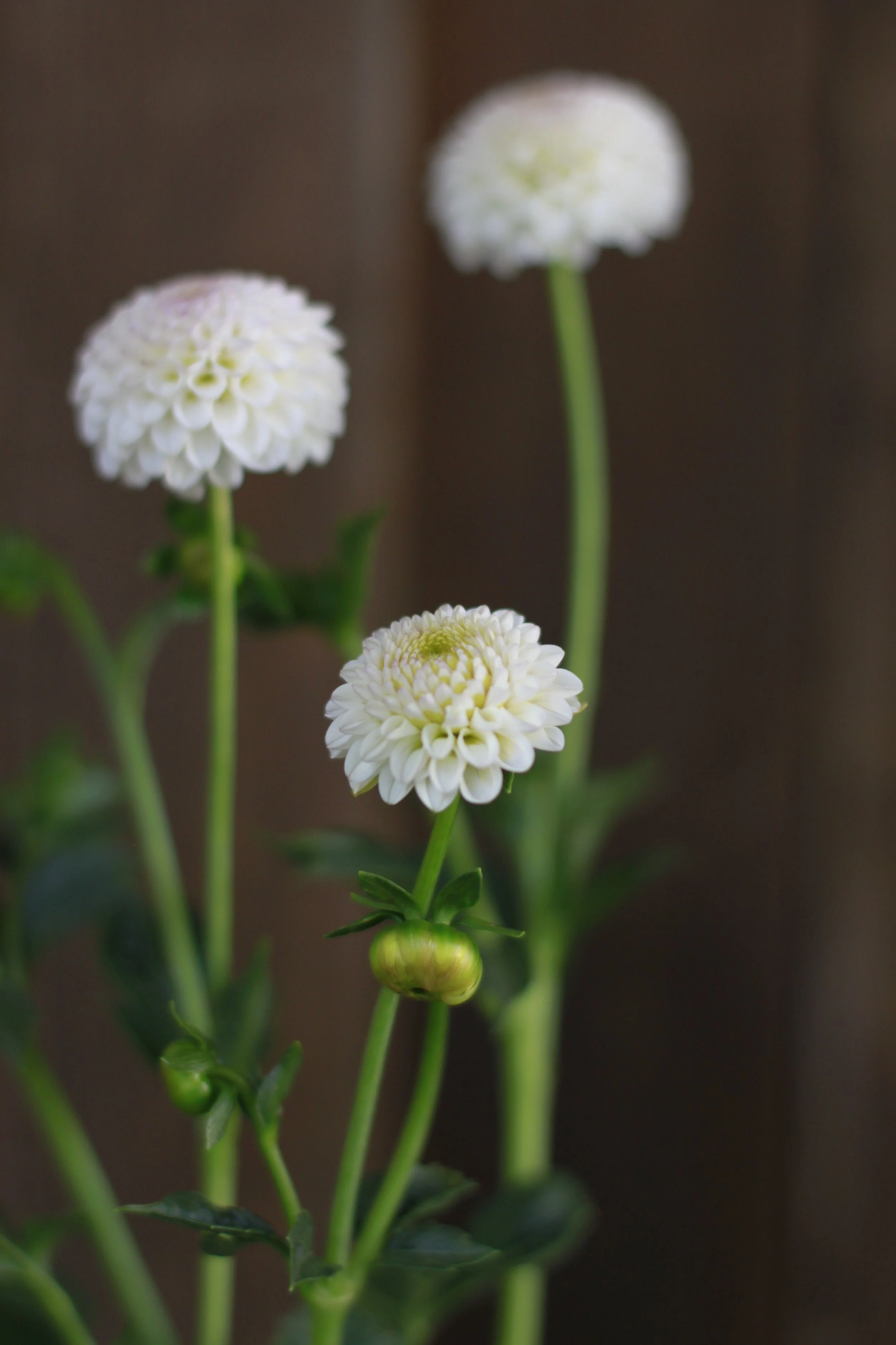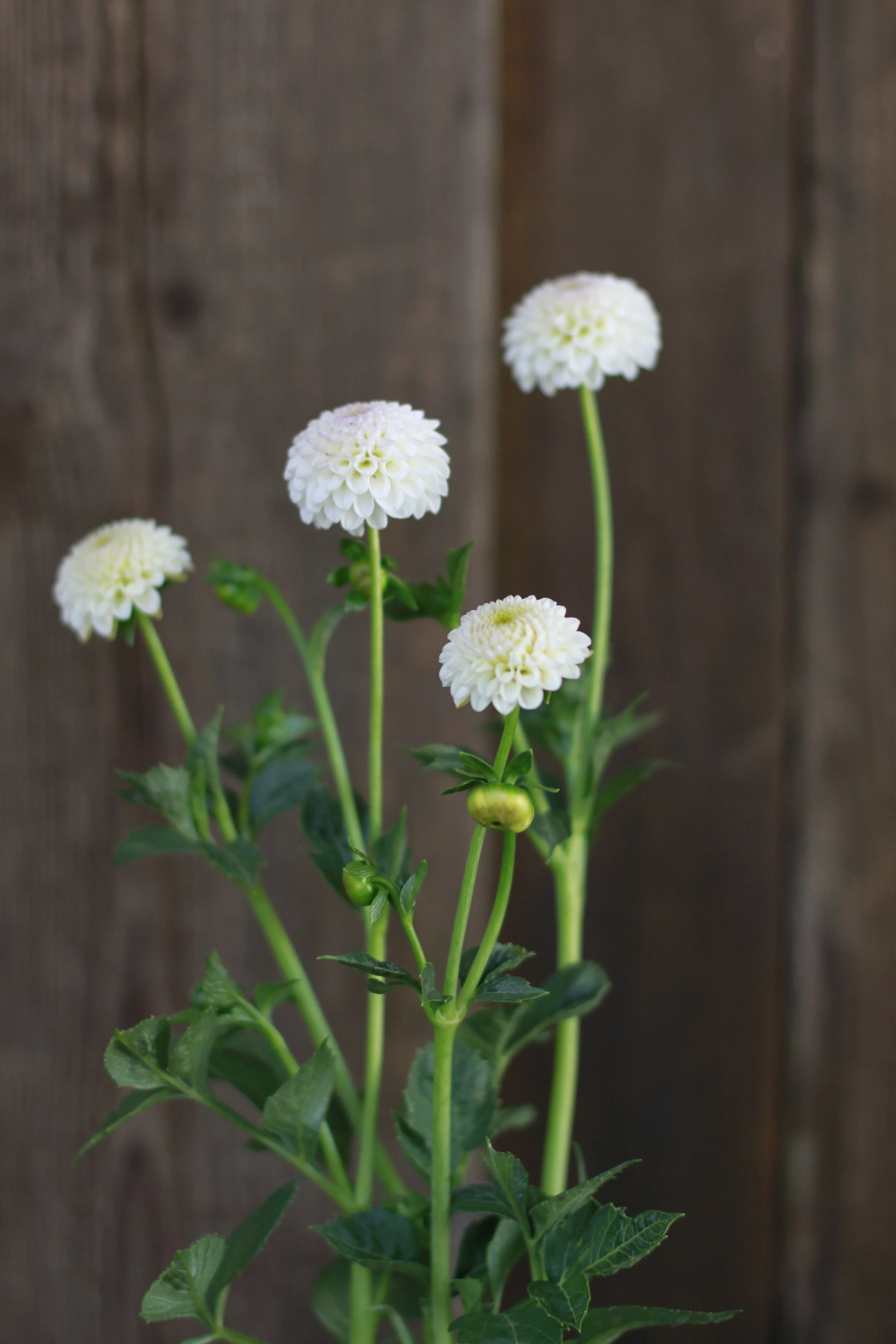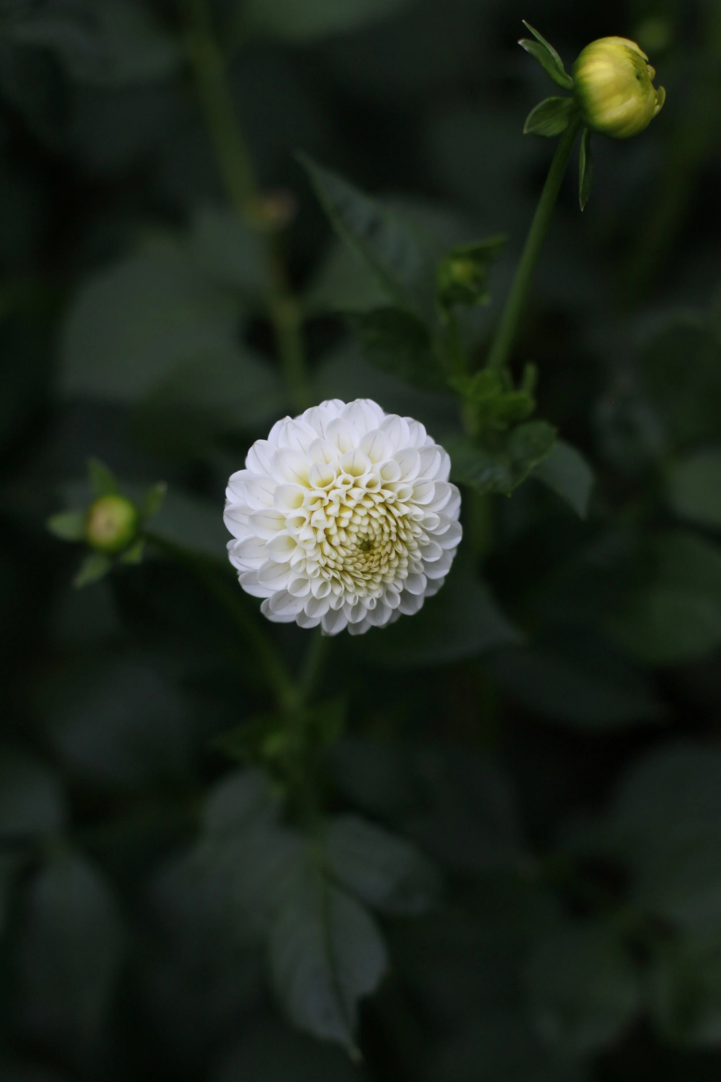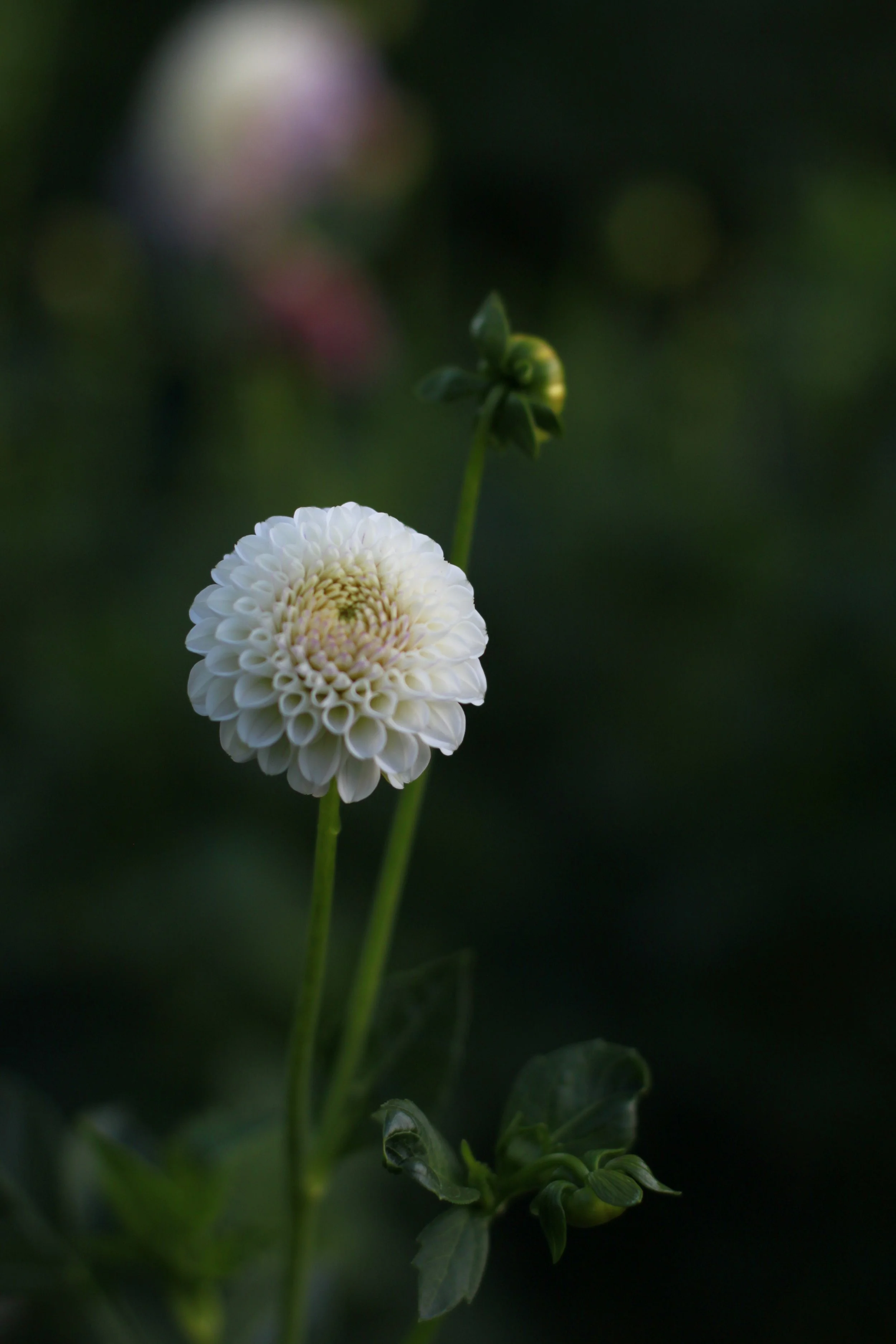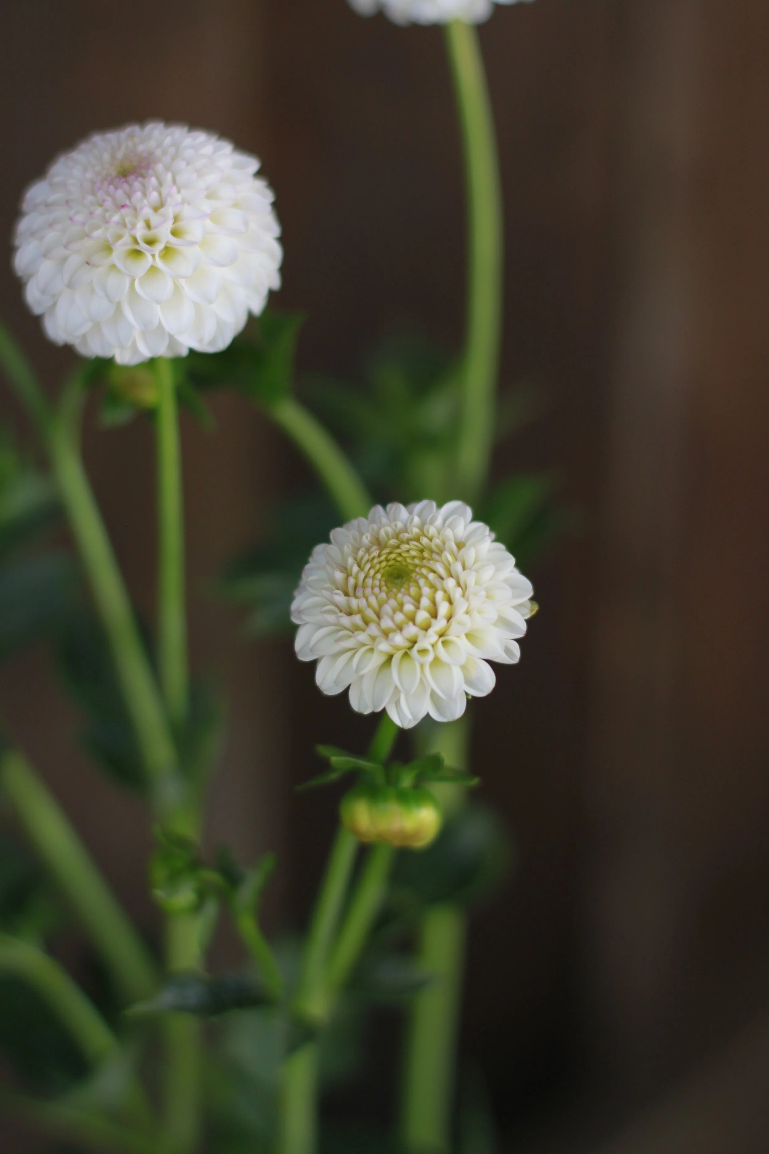 A beautiful white, petite pompon dahlia. White with a hint of pink on the petal tips.